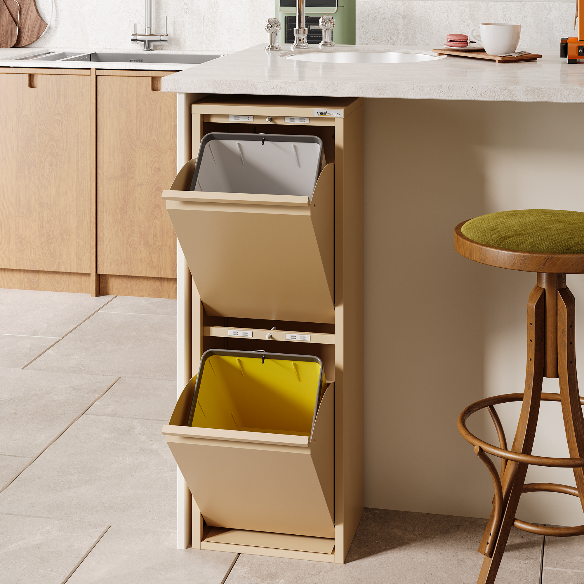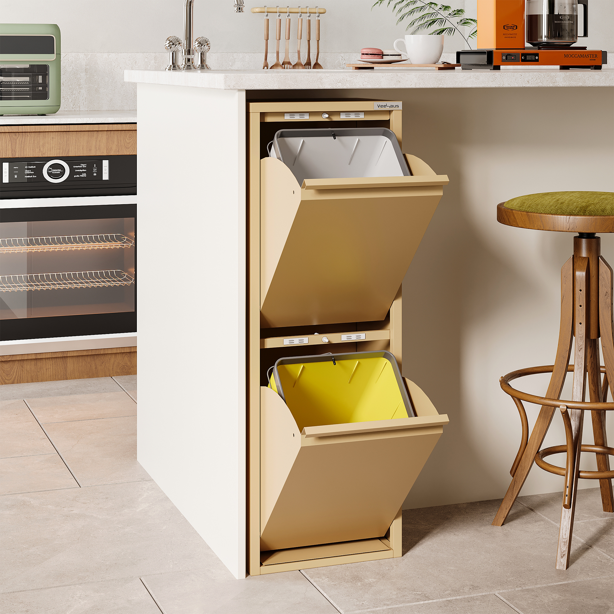 Veehaus® Clark – Prullenbak 4 vakken – Afvalemmer 60 Liter (4x 15L) – Hygienisch Recyclen – Metaal – Beige