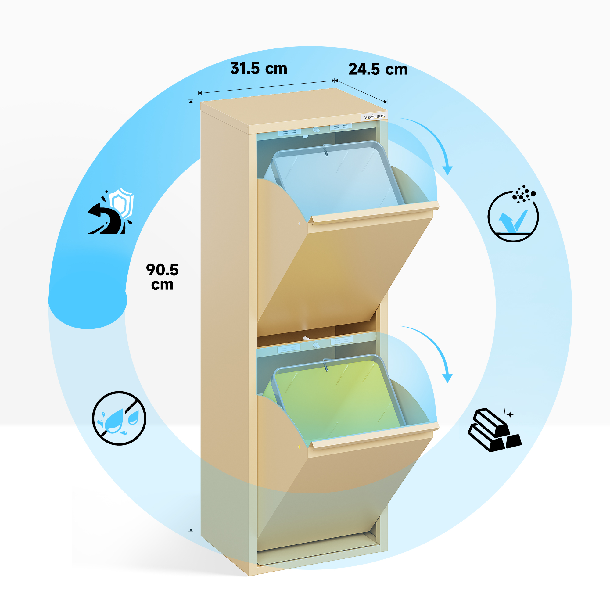 Home Prullenbak Veehaus® Allen – Prullenbak 2 vakken – Afvalemmer 30 Liter (2x 15L) – Hygienisch Recyclen – Metaal – Ivory