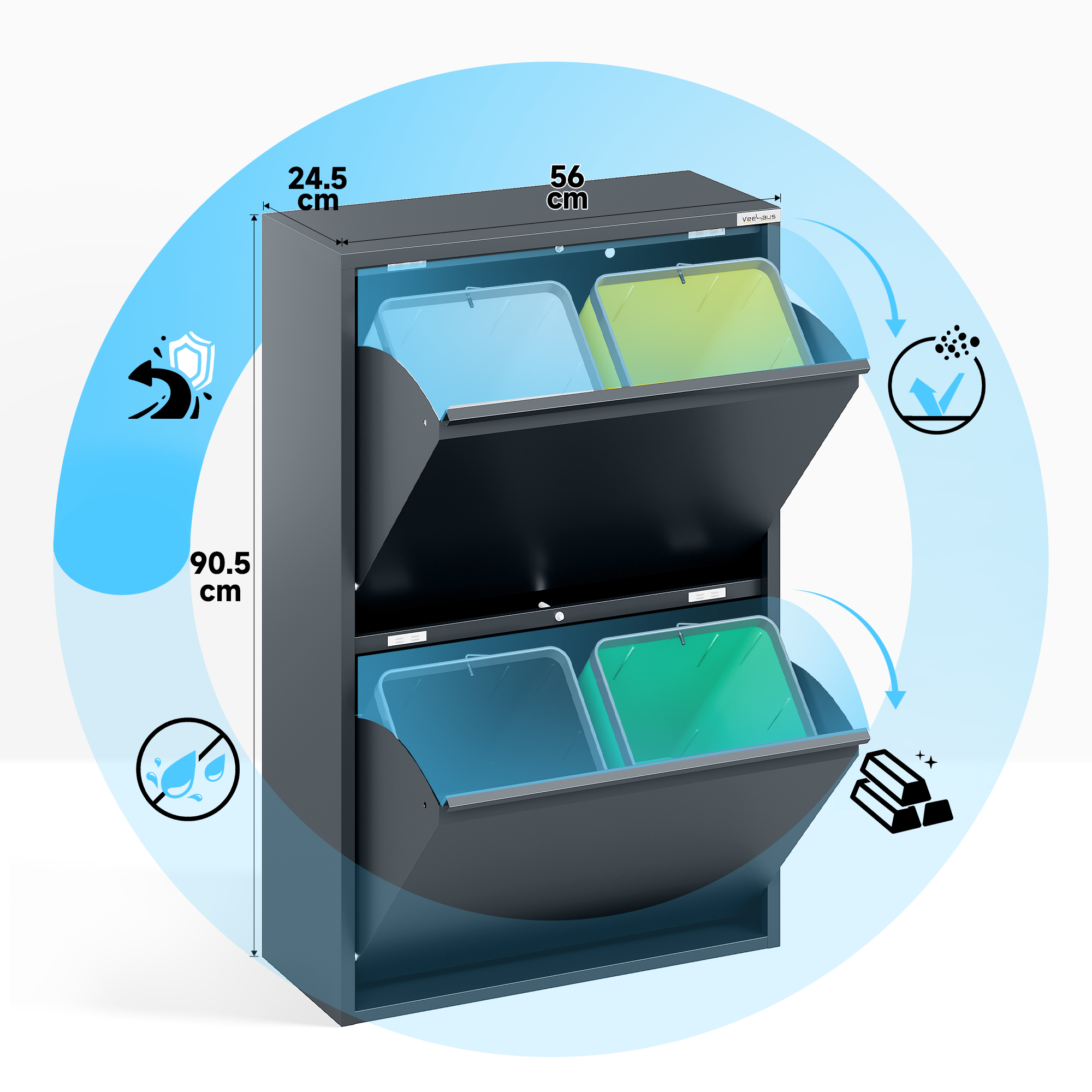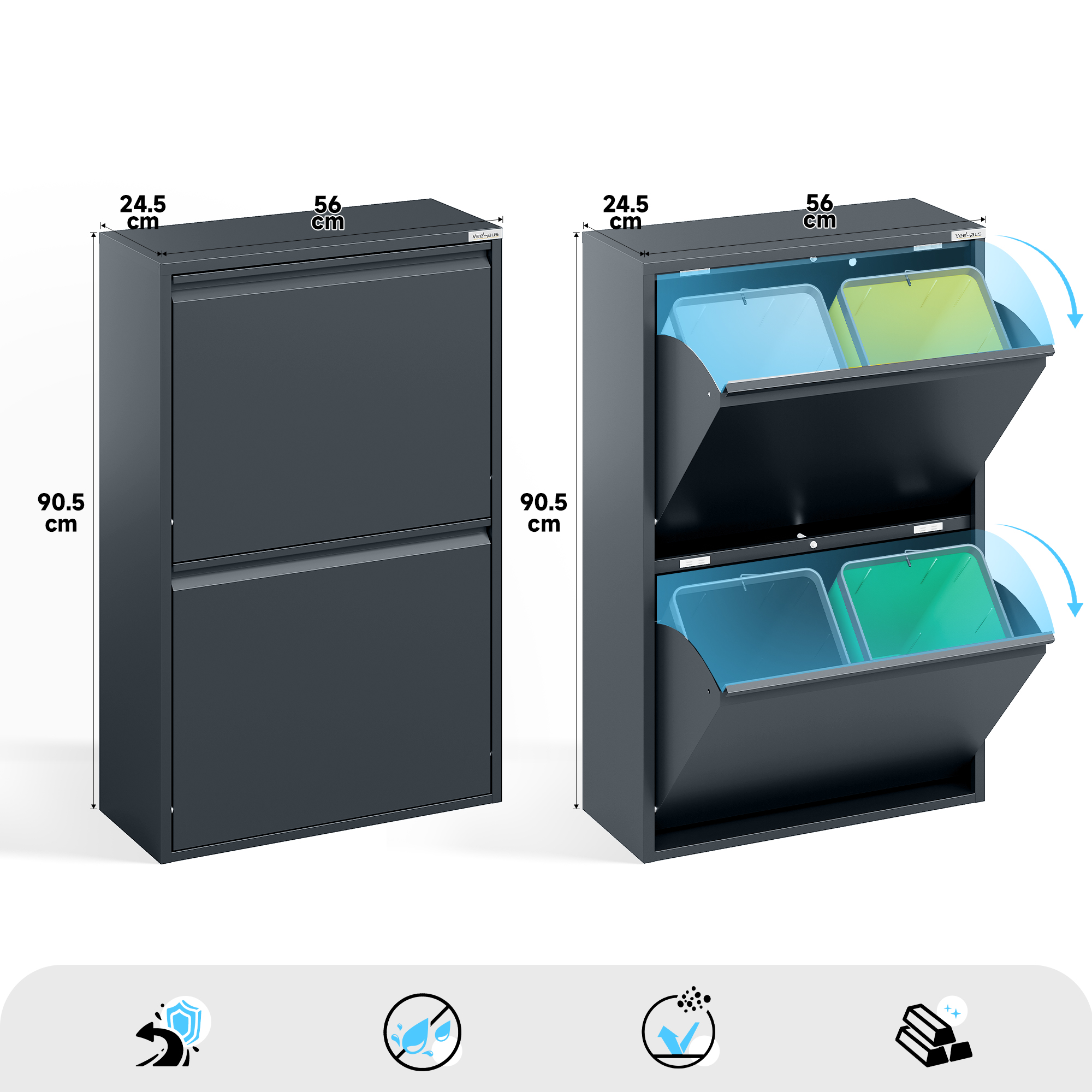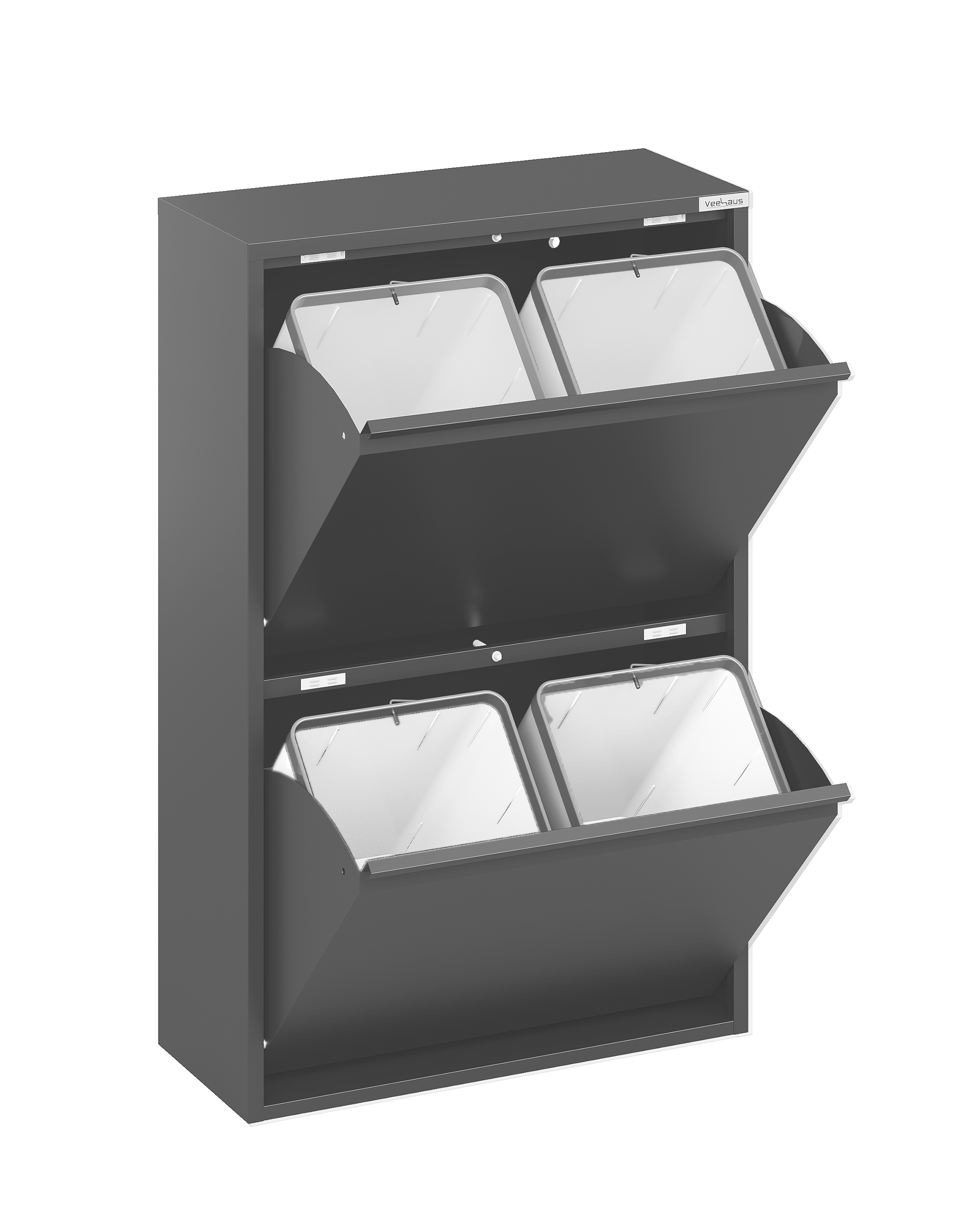 Home Prullenbak Veehaus® Clark – Prullenbak 4 vakken – Afvalemmer 60 Liter (4x 15L) – Hygiënisch Recyclen – Metaal – Antraciet