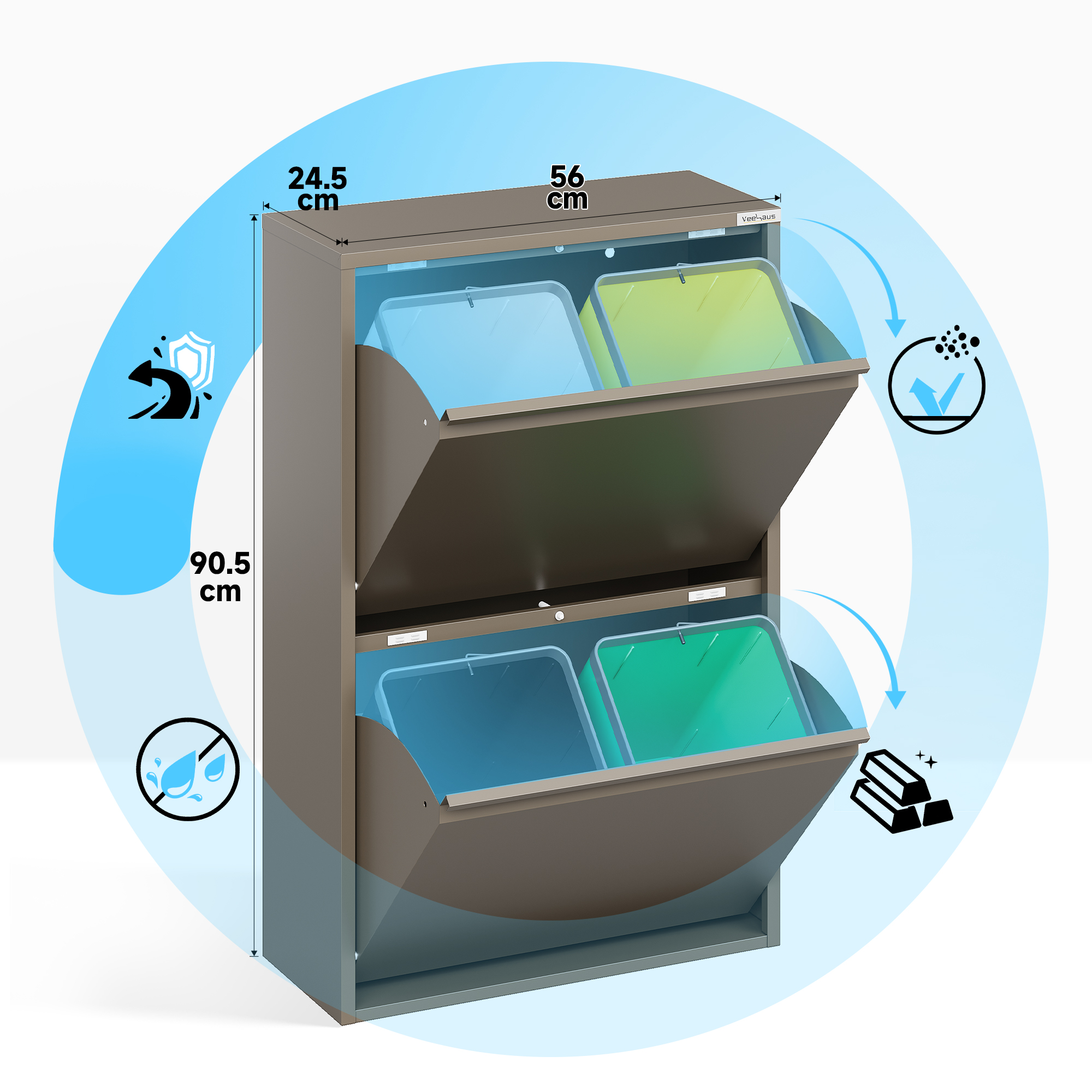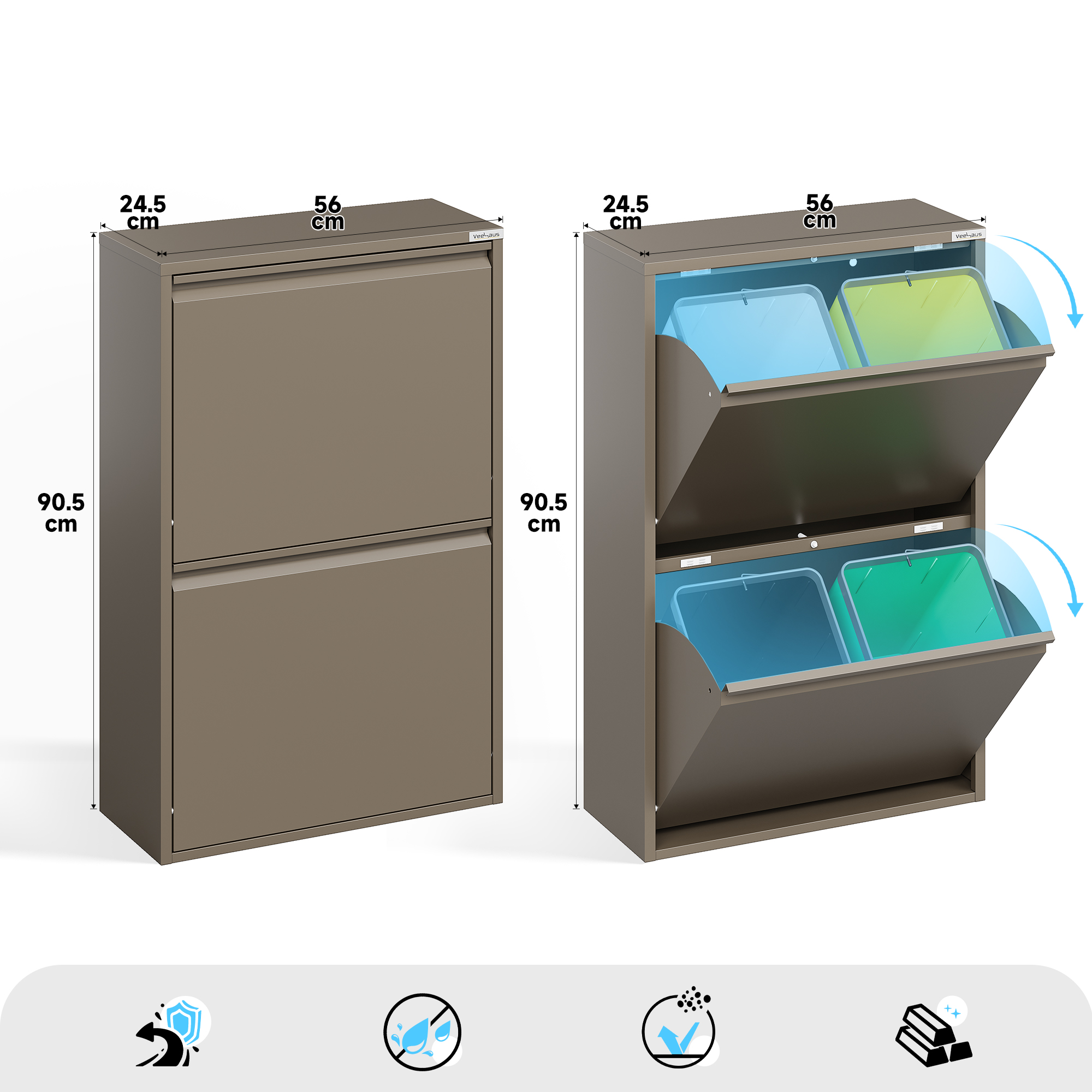 • Veelzijdig: de veelzijdige multifunctionele kast Clark van metaal is een ideale afvalscheider. Maar niet alleen als afvalscheidingssysteem is hij de perfecte aanvulling voor elk huishouden, maar ook als opbergsysteem slaat hij een goed figuur. Dankzij de hoogwaardige afwerking en look is hij geschikt voor bijna alle ruimtes.