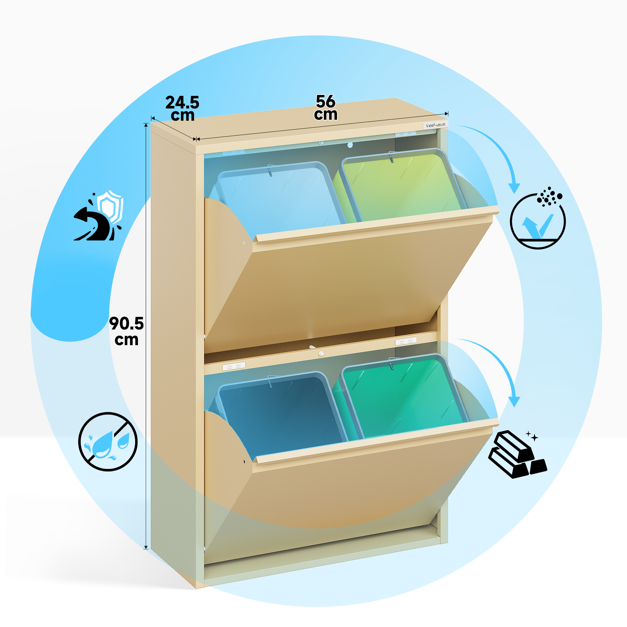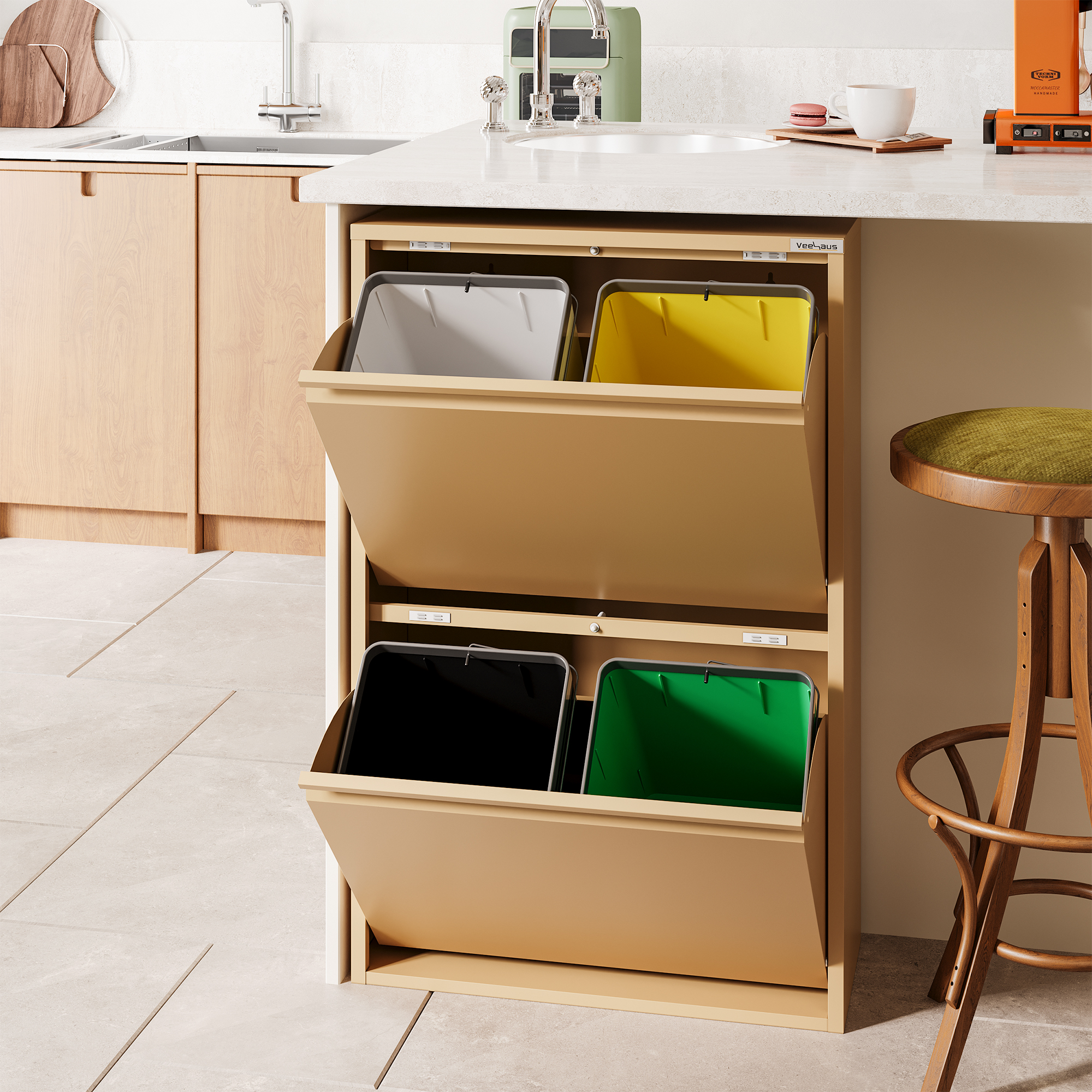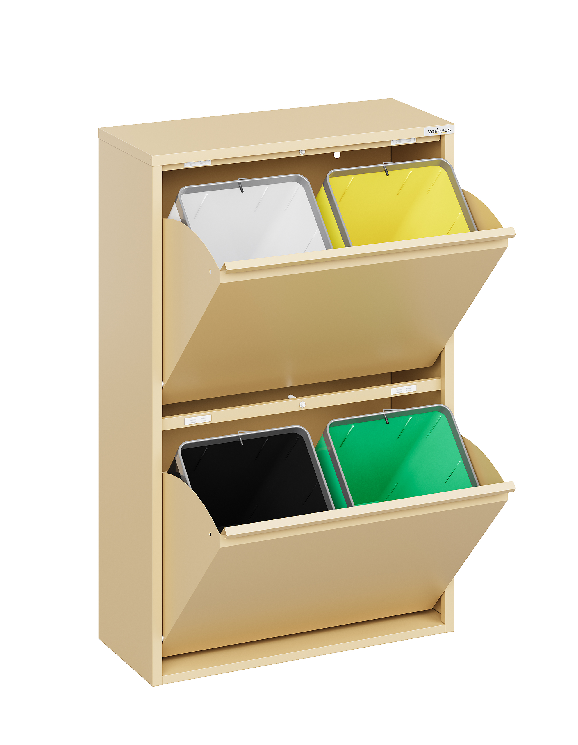Home Prullenbak Veehaus® Clark – Prullenbak 4 vakken – Afvalemmer 60 Liter (4x 15L) – Hygienisch Recyclen – Metaal – Ivory