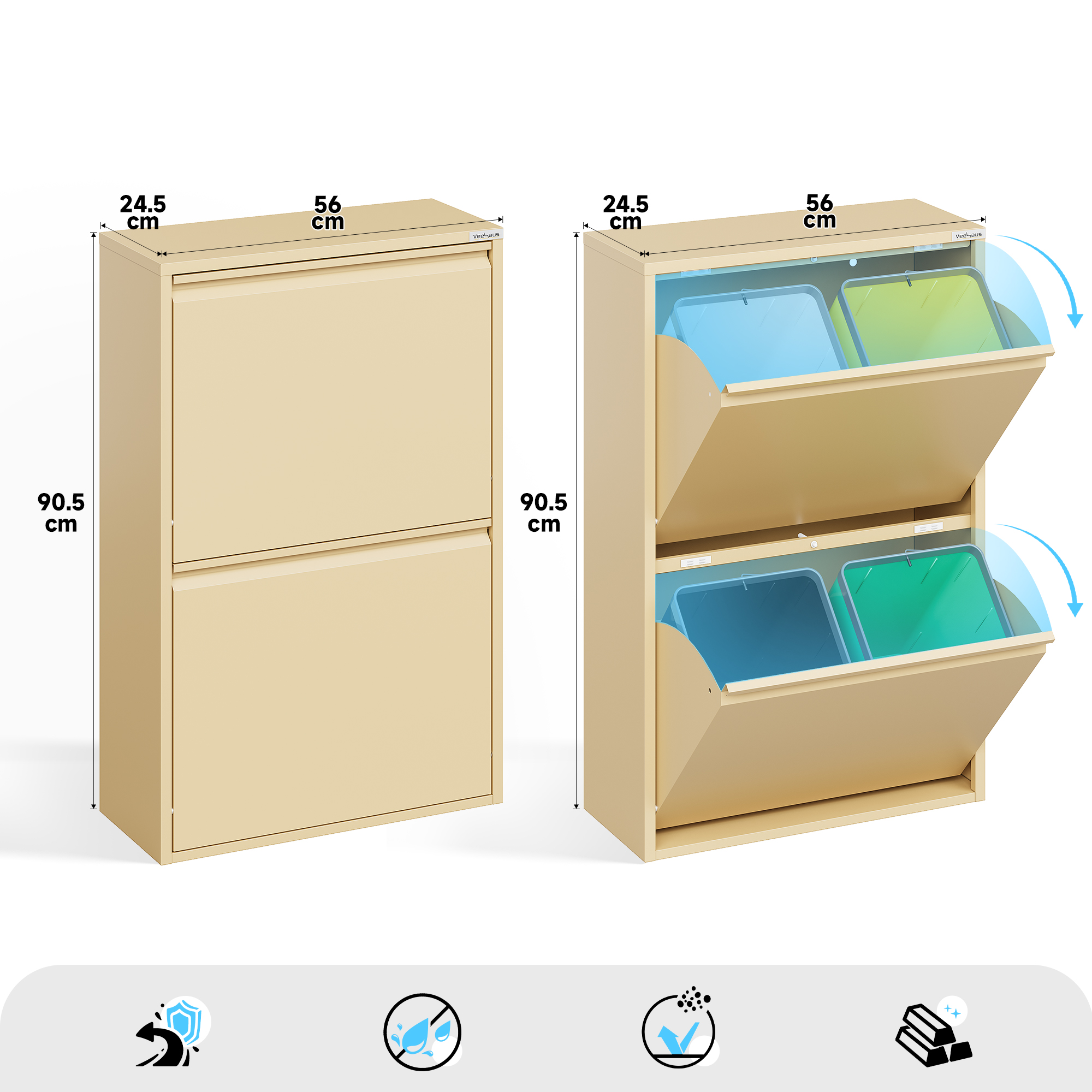 • Veelzijdig: de veelzijdige multifunctionele kast Clark van metaal is een ideale afvalscheider. Maar niet alleen als afvalscheidingssysteem is hij de perfecte aanvulling voor elk huishouden, maar ook als opbergsysteem slaat hij een goed figuur. Dankzij de hoogwaardige afwerking en look is hij geschikt voor bijna alle ruimtes.